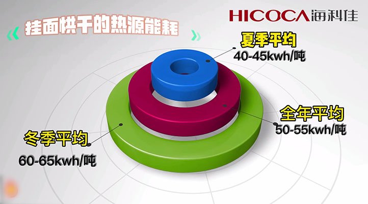 ◆ 智能節(jié)能型掛面干燥系統(tǒng)節(jié)能效果顯著,掛面烘干的熱源能耗為:夏季平均40-45kwh/噸,冬季平均60-65kwh/噸,全年平均約50-55kwh/噸。