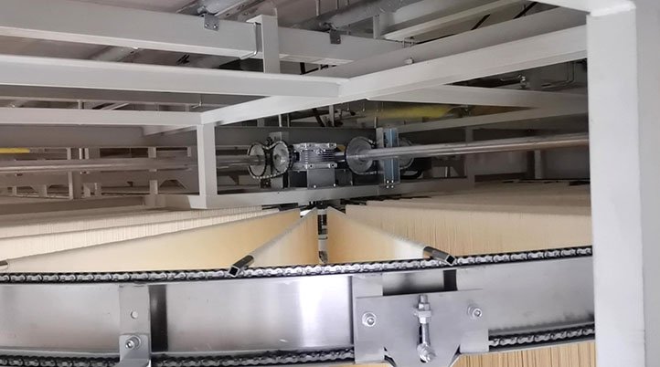 ◆ 調(diào)速式掛面輸送裝置,面桿移行速度可調(diào)、間距可調(diào)、各干燥環(huán)節(jié)的干燥時間可調(diào),充分適應(yīng)掛面柔性化生產(chǎn)。